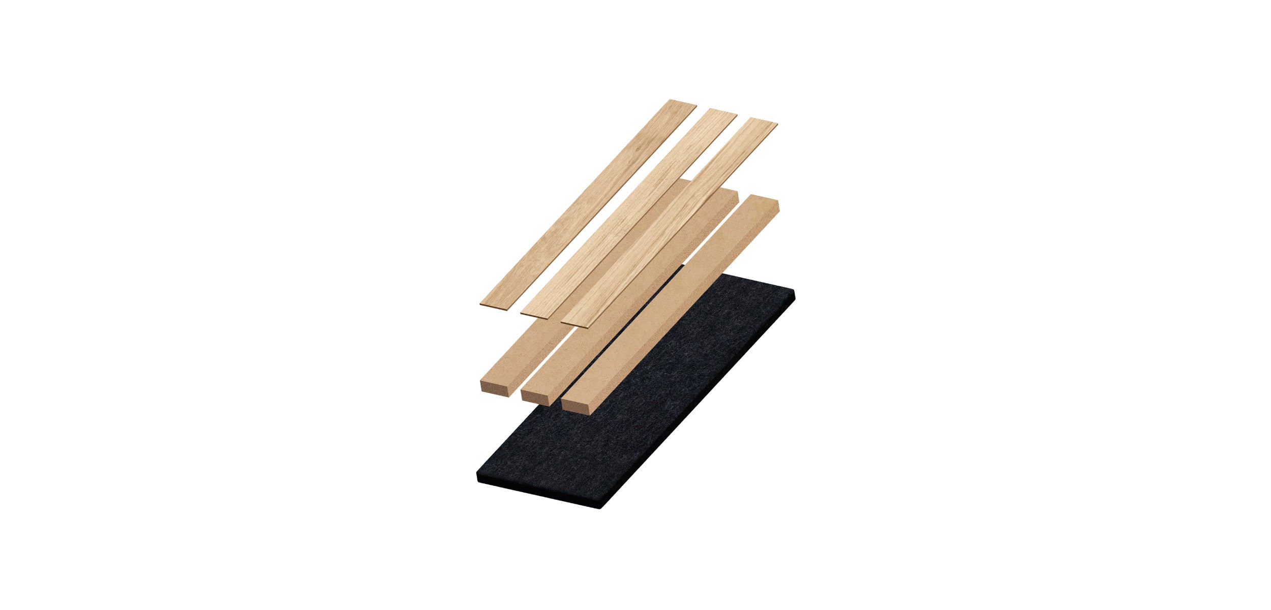O painel ripado IKARA combina camadas de lâmina de madeira natural, MDF e feltro acústico reciclado, garantindo estética, funcionalidade e sustentabilidade em cada detalhe.